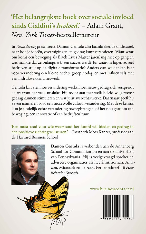 Meer over Damon CentolaIn 'Verandering' presenteert Damon Centola zijn baanbrekende onderzoek naar hoe je ideeën, overtuigingen en gedrag kunt veranderen. Want waarom komt een beweging als Black Lives Matter jarenlang niet op gang en wat maakte dat het onlangs wel een succes werd? En waarom lopen zoveel bedrijven stuk op de digitale transformatie? Anders dan we denken is er voor verandering een kleine hechte groep nodig, en niet enkele influentials met een indrukwekkend netwerk.
