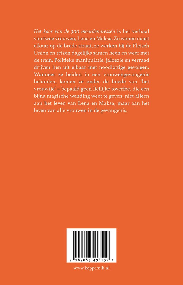 Het koor van de 300 moordenaressen is het verhaal van twee vrouwen, Lena en Maksa. Ze wonen naast elkaar op de brede straat, ze werken bij de Fleisch Union en reizen dagelijks samen heen en weer met de tram. Politieke manipulatie, jaloezie en verraad drijven hen uit elkaar met noodlottige gevolgen. Wanneer ze beiden in een vrouwengevangenis belanden, komen ze onder de hoede van ‘het vrouwtje’ – bepaald geen lieflijke toverfee, die een bijna magische wending weet te geven, niet alleen aan het leven van Lena en Maksa, maar aan het leven van alle vrouwen in de gevangenis.