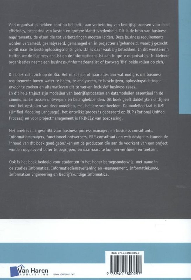 Dit boek richt zich op de Bia. Het reikt hem of haar alles aan wat nodig is om business requirements boven water te halen, te analyseren, te beschrijven, oplossingsrichtingen ervoor te zoeken en alternatieven uit te werken inclusief business cases. In dit hele traject zijn modellen van bedrijfsprocessen en datamodellen essentieel in de communicatie tussen ontwerpers en belanghebbenden. Dit boek geeft duidelijke richtlijnen voor het opstellen van deze modellen, met heldere voorbeelden. De modelleertaal is UML (Unified Modeling Language), het ontwikkelproces is gebaseerd op RUP (Rational Unified Process) en voor projectmanagement is PRINCE2 van toepassing.
