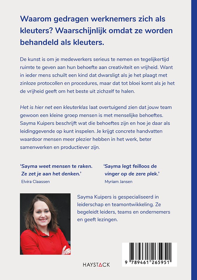 Het is hier net een kleuterklas laat overtuigend zien dat jouw team gewoon een kleine groep mensen is met menselijke behoeftes. Sayma Kuipers beschrijft wat die behoeftes zijn en hoe je daar als leidinggevende op kunt inspelen. Je krijgt concrete handvatten waardoor mensen meer plezier hebben in het werk, beter samenwerken en productiever zijn.