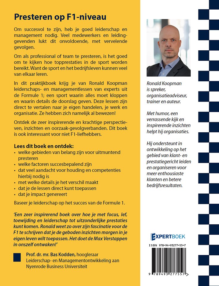 In dit praktijkboek krijg je van Ronald Koopman leiderschaps- en managementlessen van experts uit de Formule 1; een sport waarin alles moet kloppen en waarin details de doorslag geven. Deze lessen zijn direct te vertalen naar je eigen handelen, je werk en organisatie. Ze hebben zich namelijk al bewezen! Ontdek de zeer inspirerende en krachtige perspectieven, inzichten en oorzaak-gevolgverbanden.